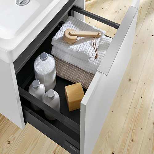 Die Architectura-Keramik wird ergänzt durch eine neue, eigene Möbelkollektion, die Unterschränke in allen Waschtischbreiten vom 100er Schrankwaschtisch bis zum 36er Handwaschbecken sowie zwei passende Hochschränke umfasst. Je nach Modell und Breite sind die Unterschränke mit Auszügen oder Türen bzw. mit Türen und einem offenen Fach ausgestattet. Auszüge und Türen, die alle mit SoftClosing-Funktion versehen sind, werden mit einer aufgesetzten Griffleiste geöffnet und geschlossen. Die Möbel sind in fünf aktuellen Oberflächen erhältlich: Neben den warmen Holztönen Nordic Oak und Kansas Oak gibt es die zeitlosen Unifarben Farben Glossy White, Glossy Grey und White Matt, die via Express Delivery kurzfristig lieferbar sind.